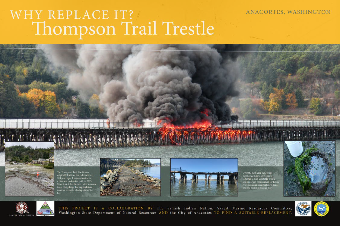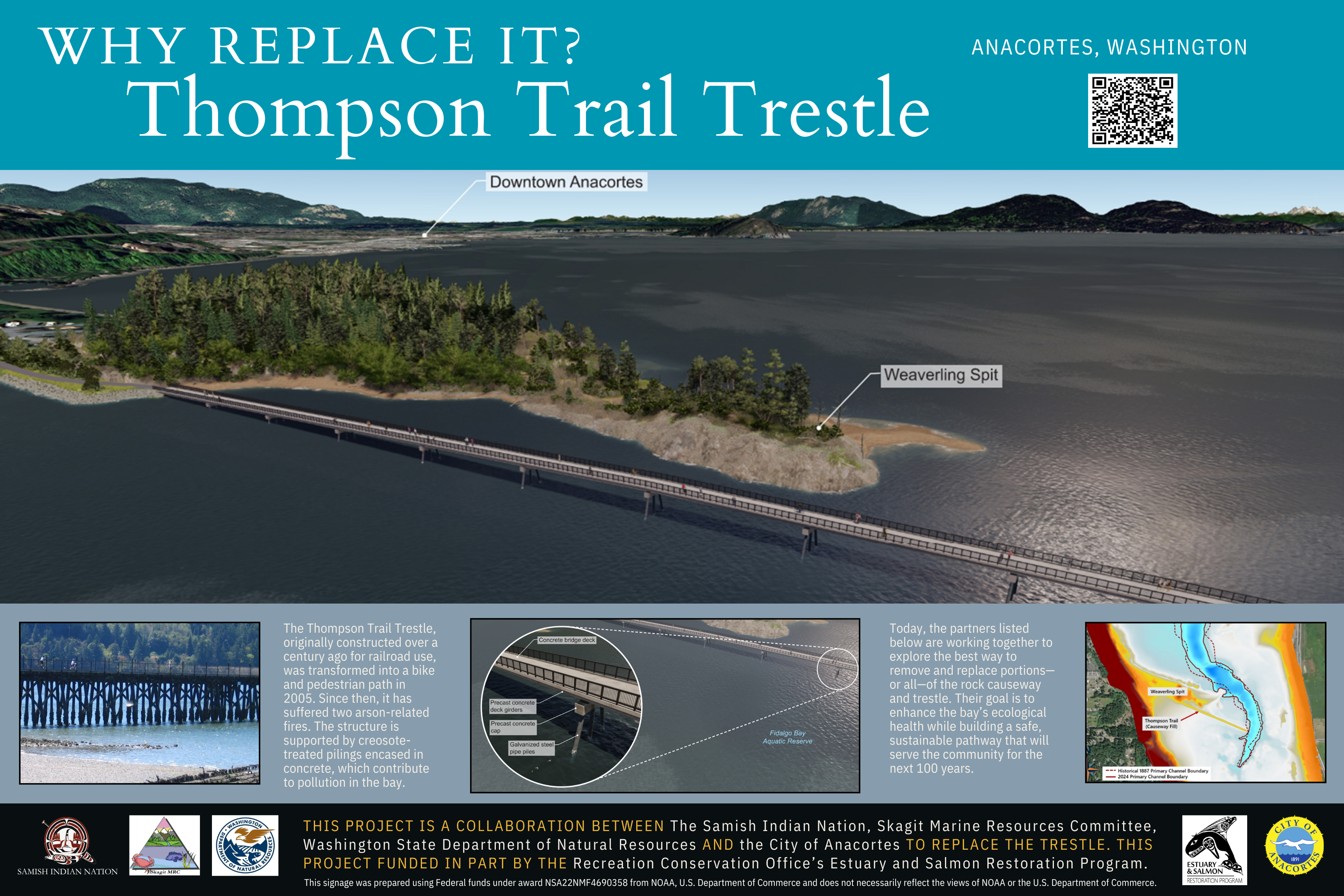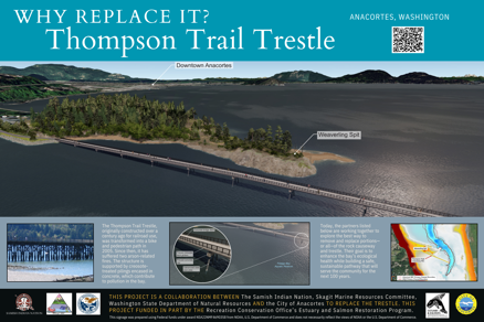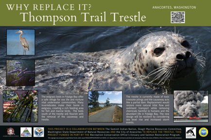 This project is part of a large collaborative long-term multiple year effort led by the City of Anacortes that aims to replace the existing trestle with environmentally friendly non-creosote material and remove the entire riprap causeway from the trestle crossing over to Weaverling Spit. Full removal of the causeway will increase flow and flushing of the Fidalgo Bay system which will improve water quality, nearshore species and habitat and reduce wave energy and shoreline erosion. The trestle's creosote pilings contain toxic chemicals that leach into the sediment. Creosote is also highly flammable and the trestle has burned twice in arson fires, releasing toxic chemicals into the air. Removing the creosote pilings and associated sediment and replacing with environmentally material will reduce the fire risk and will improve water quality and health of aquatic organisms.