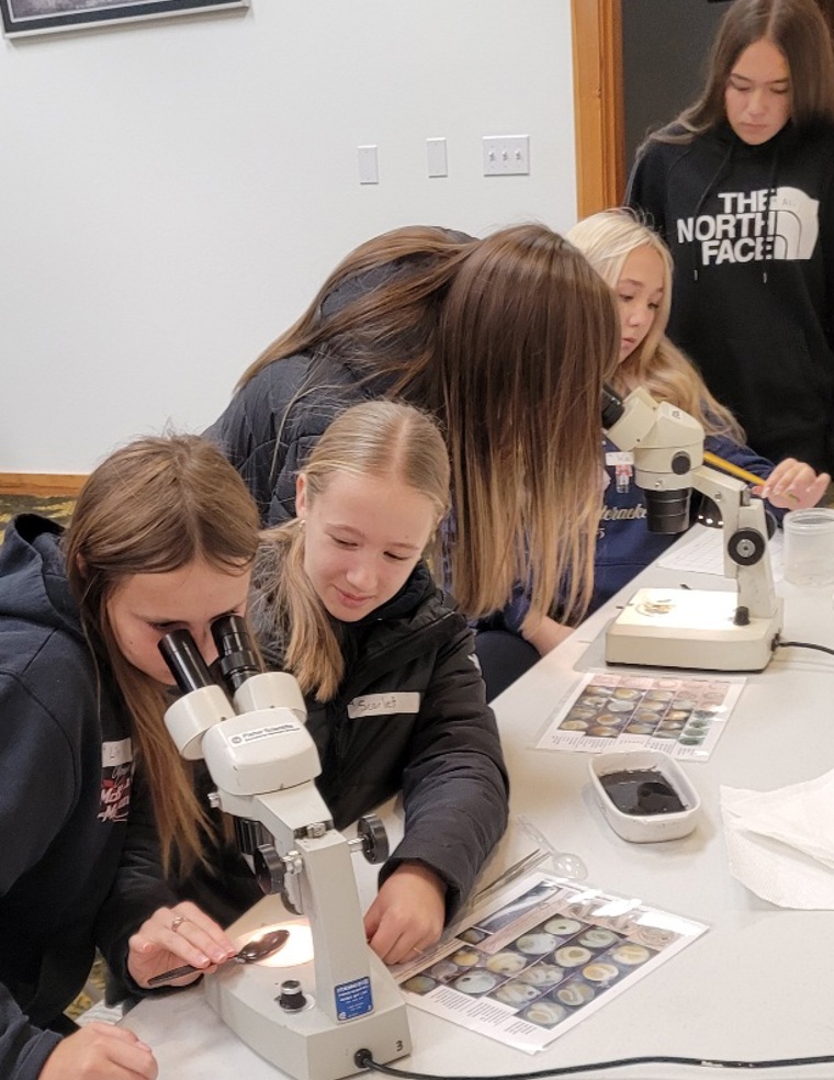 Conway Middle School students identify surf smelt eggs under microscopes (photo credit: Pete Haase)