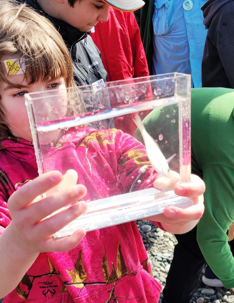Sedro-Woolley 6th grade student holding a photarium with a fish caught during a beach seine activity at Bayview State Park (photo credit: Annie England, PBNERR)